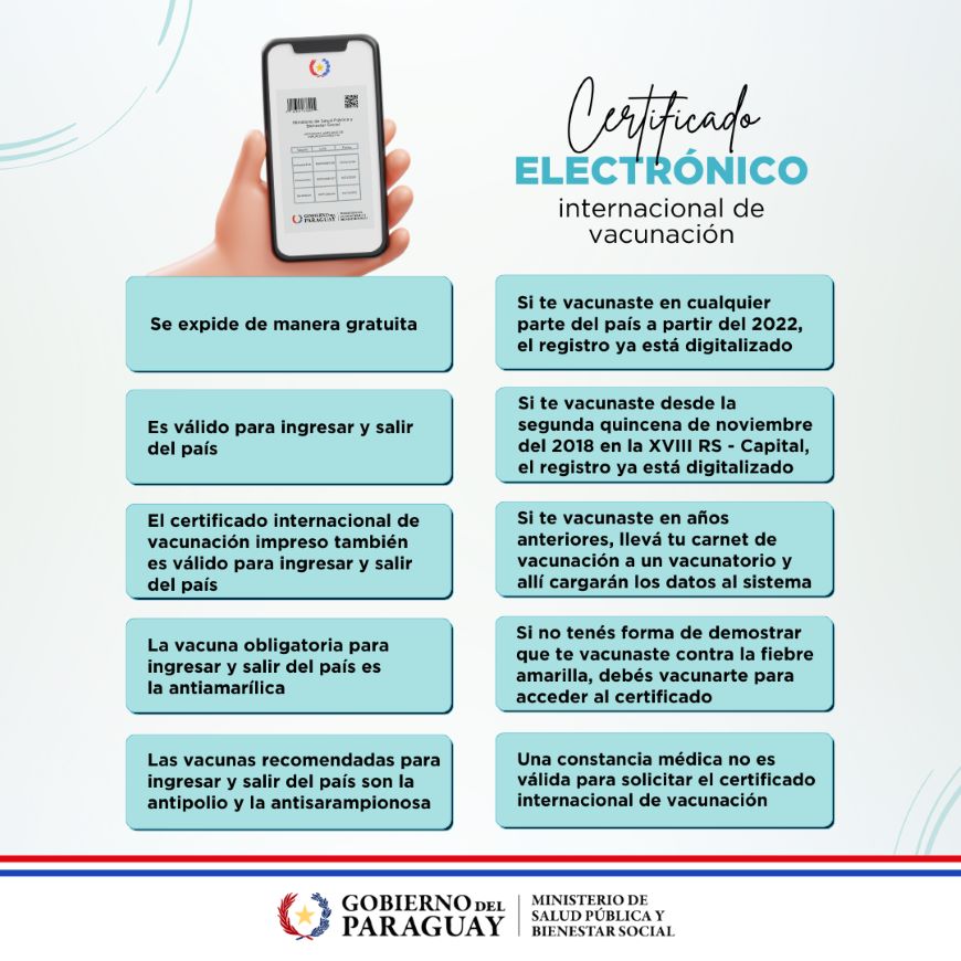 El Ministerio de Salud Pública y Bienestar Social recuerda que es obligatorio presentar el Certificado Internacional de Vacunación contra la fiebre amarilla, en formato físico o digital, para: