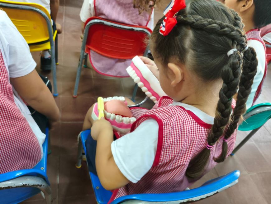 Como complemento práctico a la capacitación, cada estudiante recibió un kit de higiene bucal compuesto por cepillo y pasta dental.