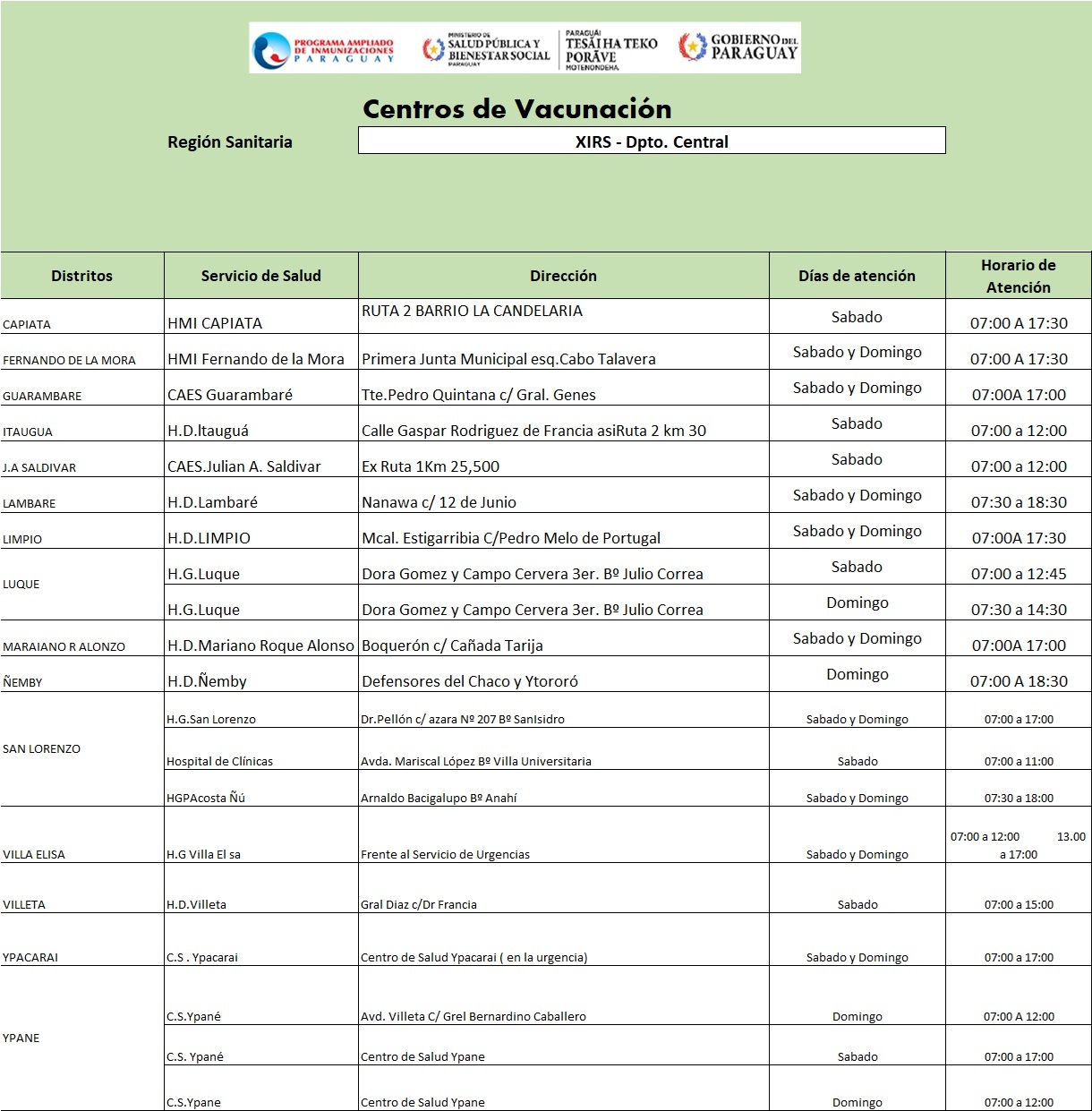 Centros de Vacunación Fin de Semana – Central